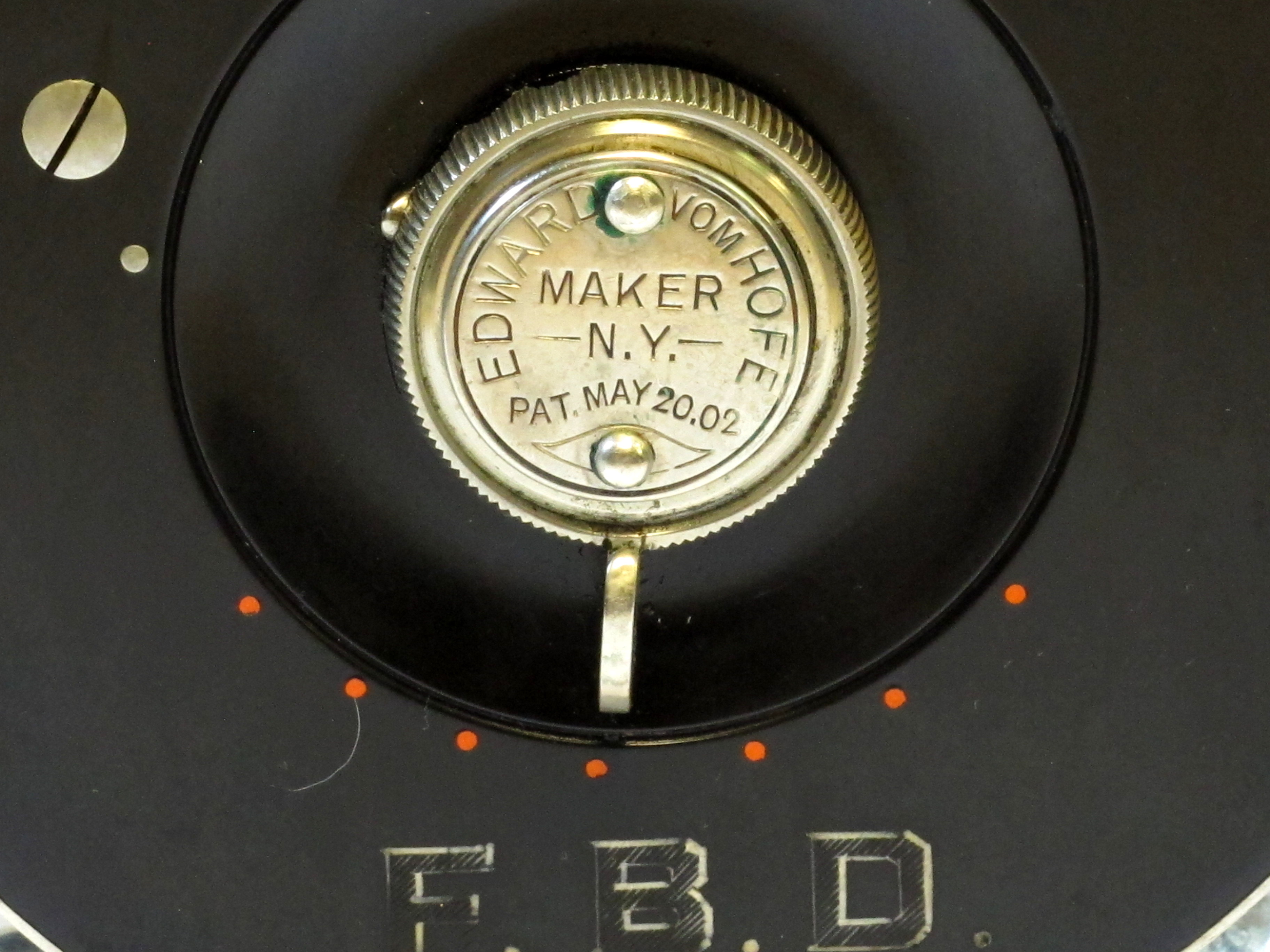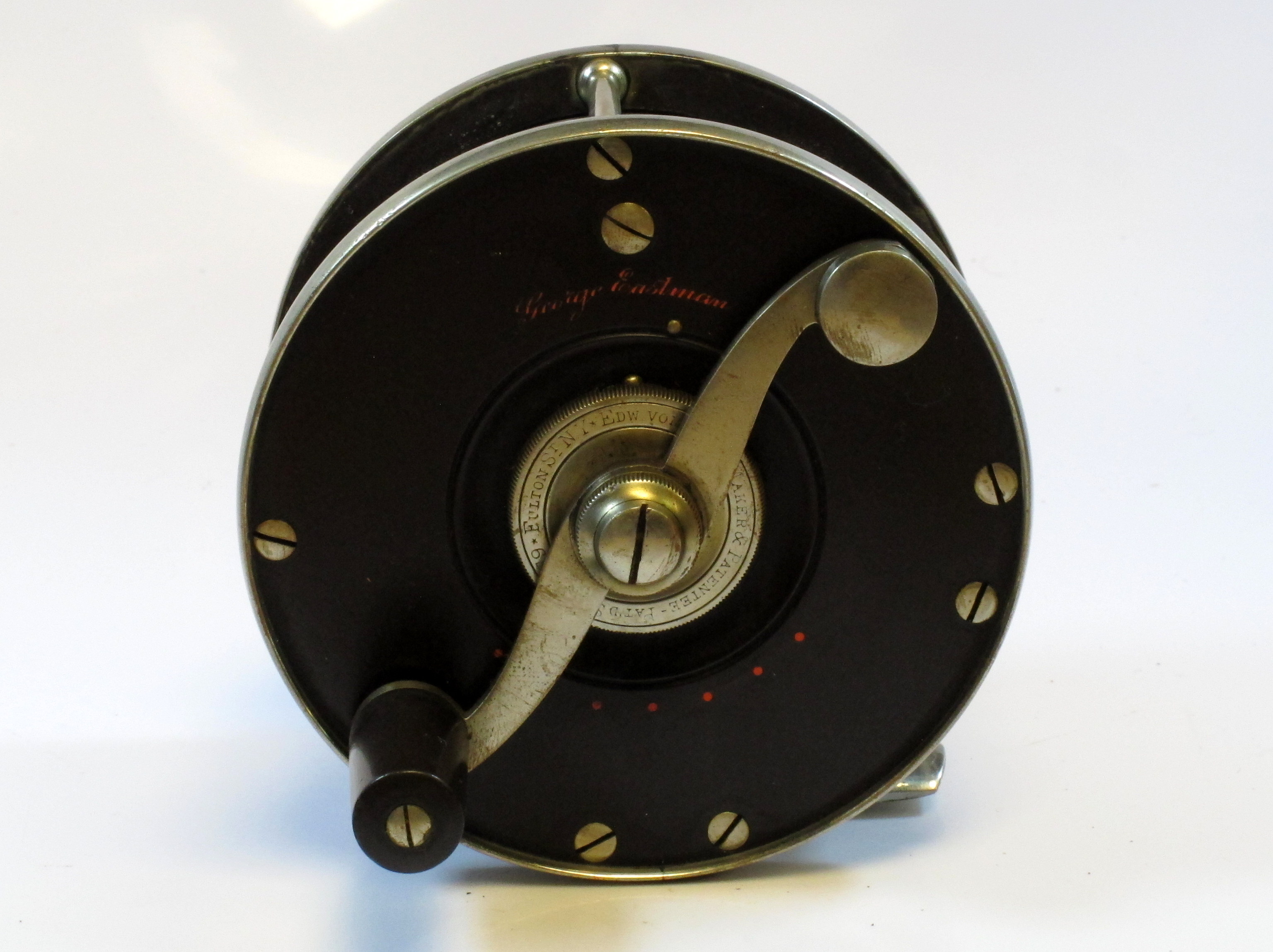 Edward vom Hofe, 423, 4-0, early drag feature setting under the handle, arrow head style detent indicator with 7 red dots, Pat. '83 on the oil cap. A '79 Pat. date on the detent. The leather case has a brass plate, engraved 'G. E.', the reel is engraved: 'George Eastman'. (George Eastman (1854-1921), founder of the Eastman Kodak Company of Rochester, NY. )SOLD |