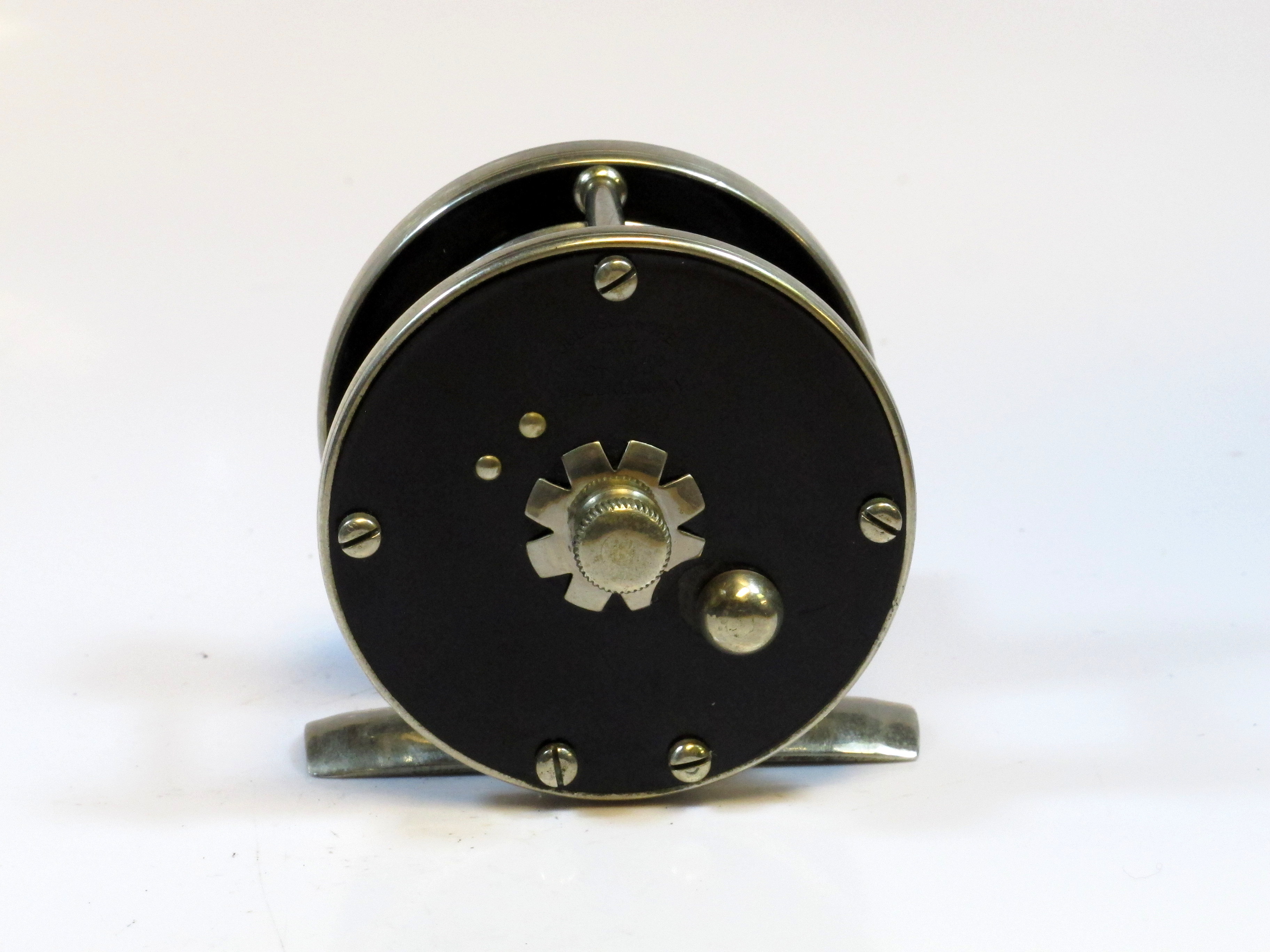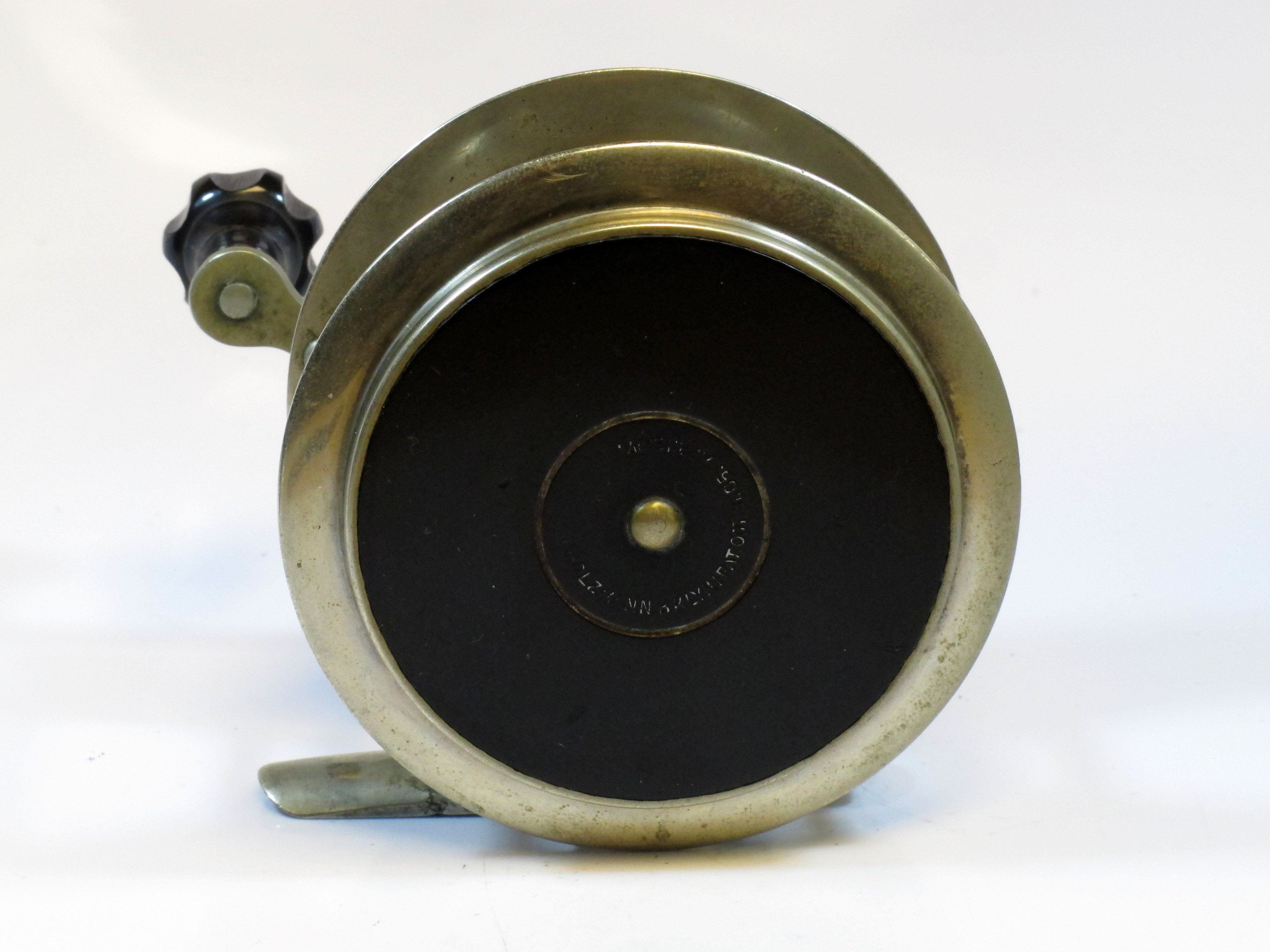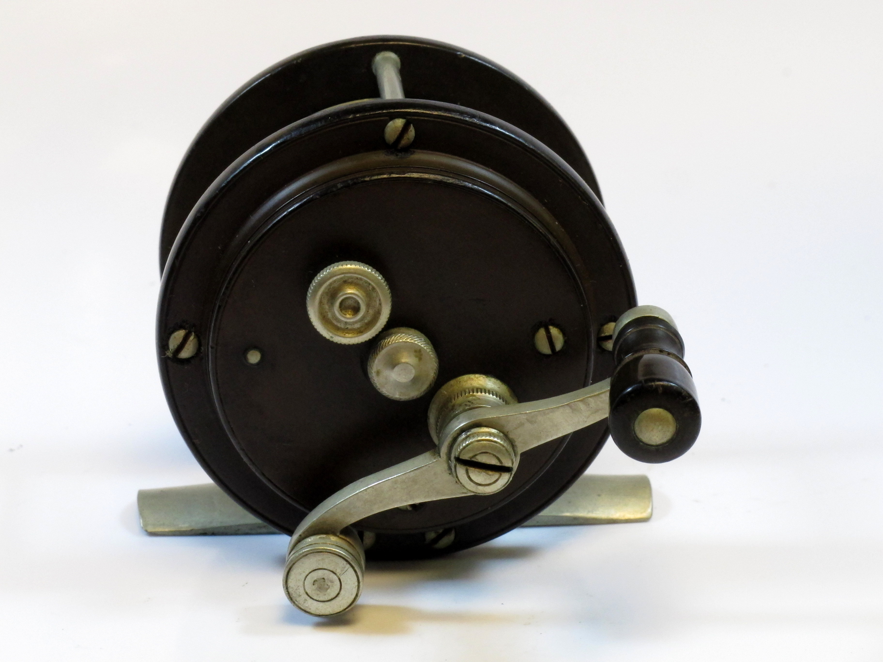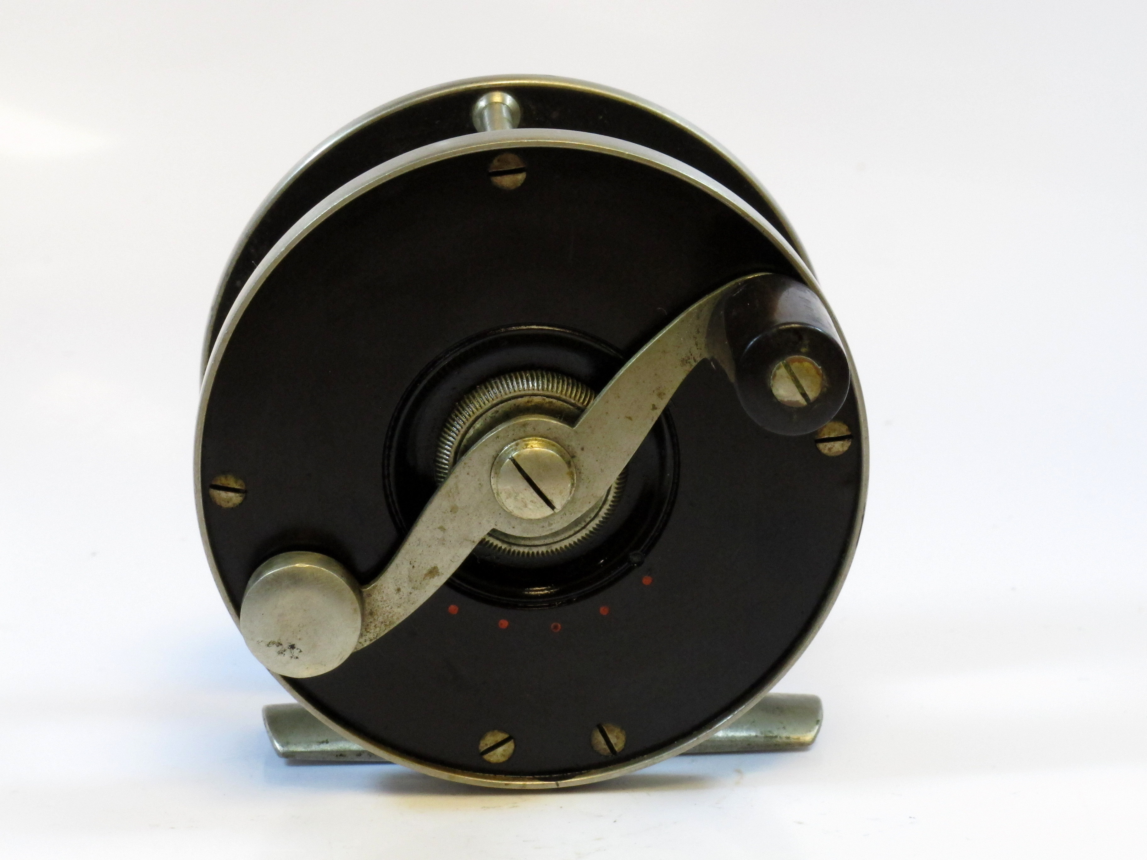 Julius vom Hofe black reel, no numbers or names. Hard rubber, multiplier. Very early. See identical type reel 371SOLD |