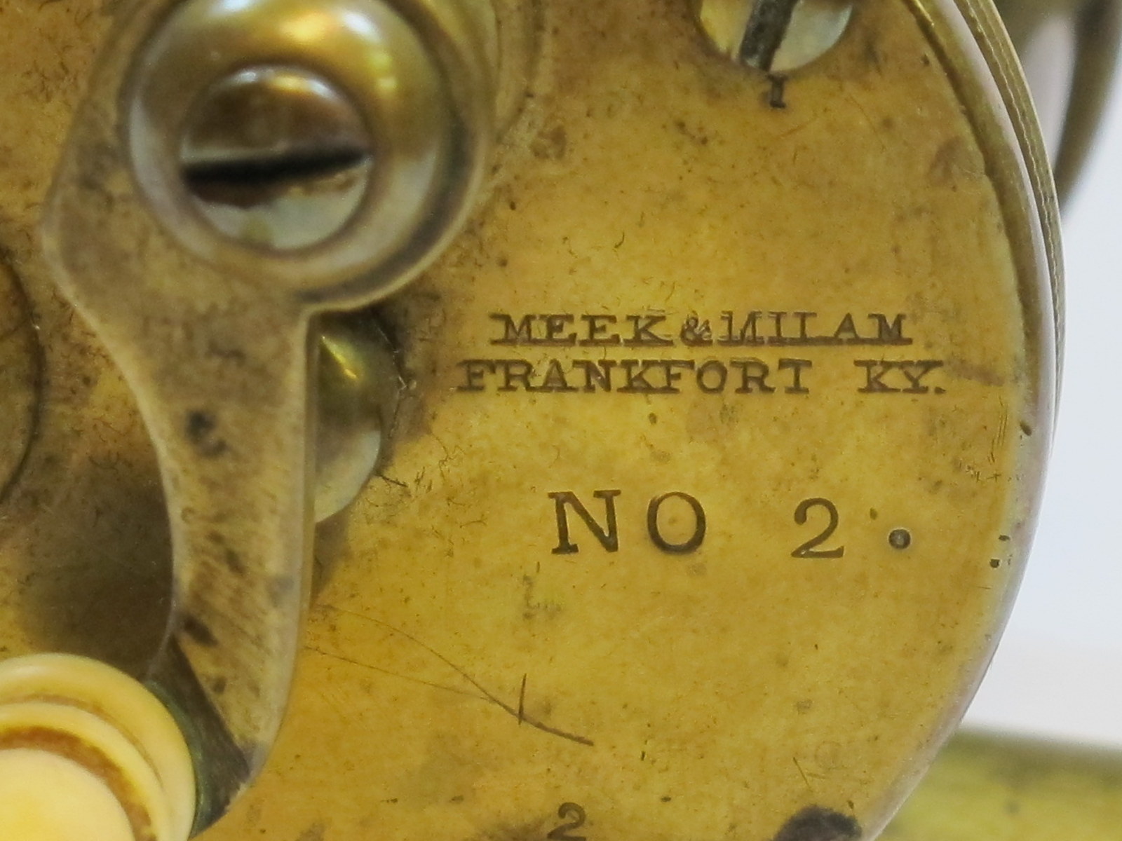 J. F. & B. F. Meek, Frankfort, Ky., No. 1, wide spool, early numbered screws, very rare configuration and size$13,500 |