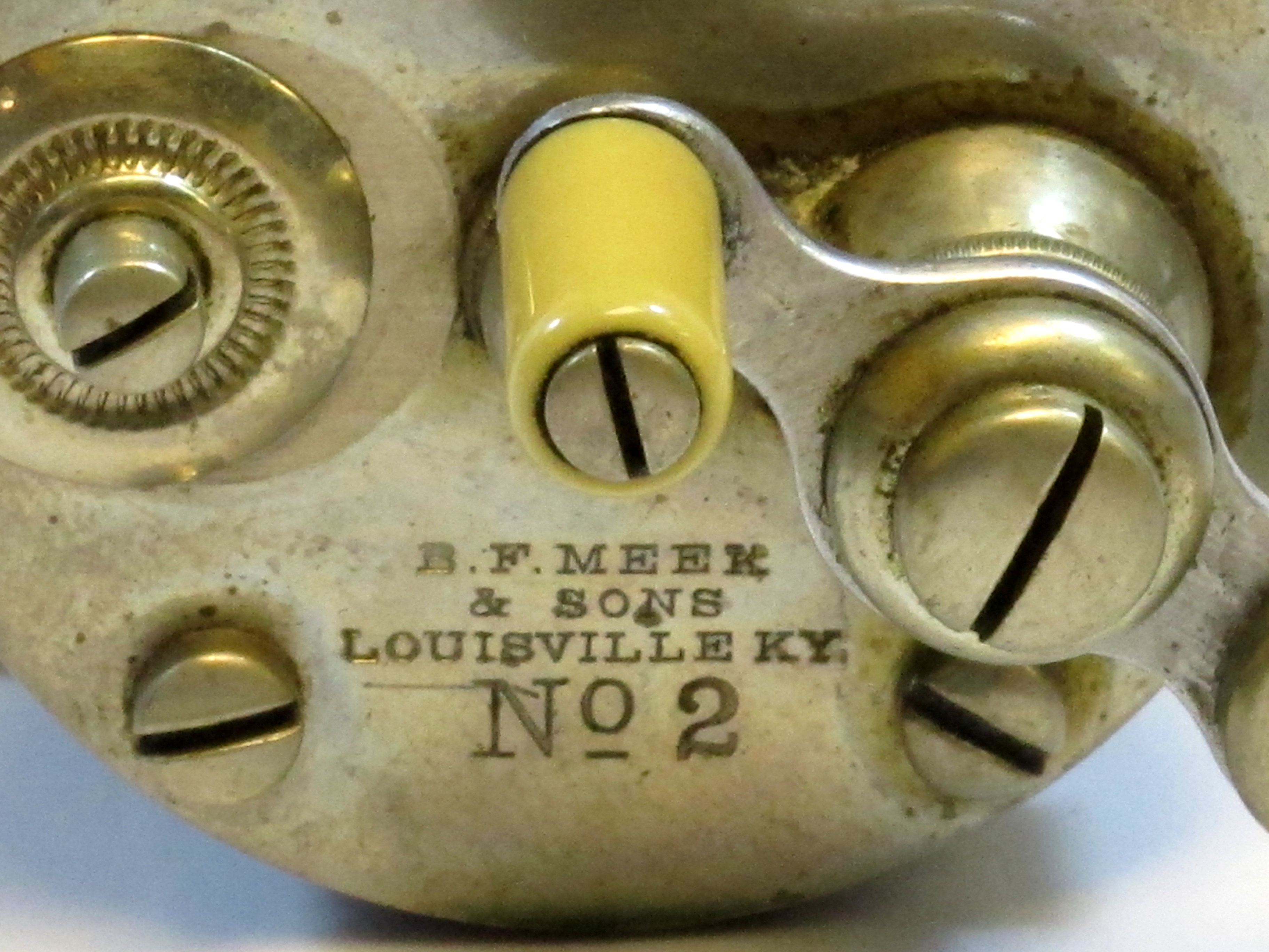 B. F. Meek & Sons, Louisville, Ky., No. 2, sn. 4310, tournament handle, wide spool, GS$1,400 |