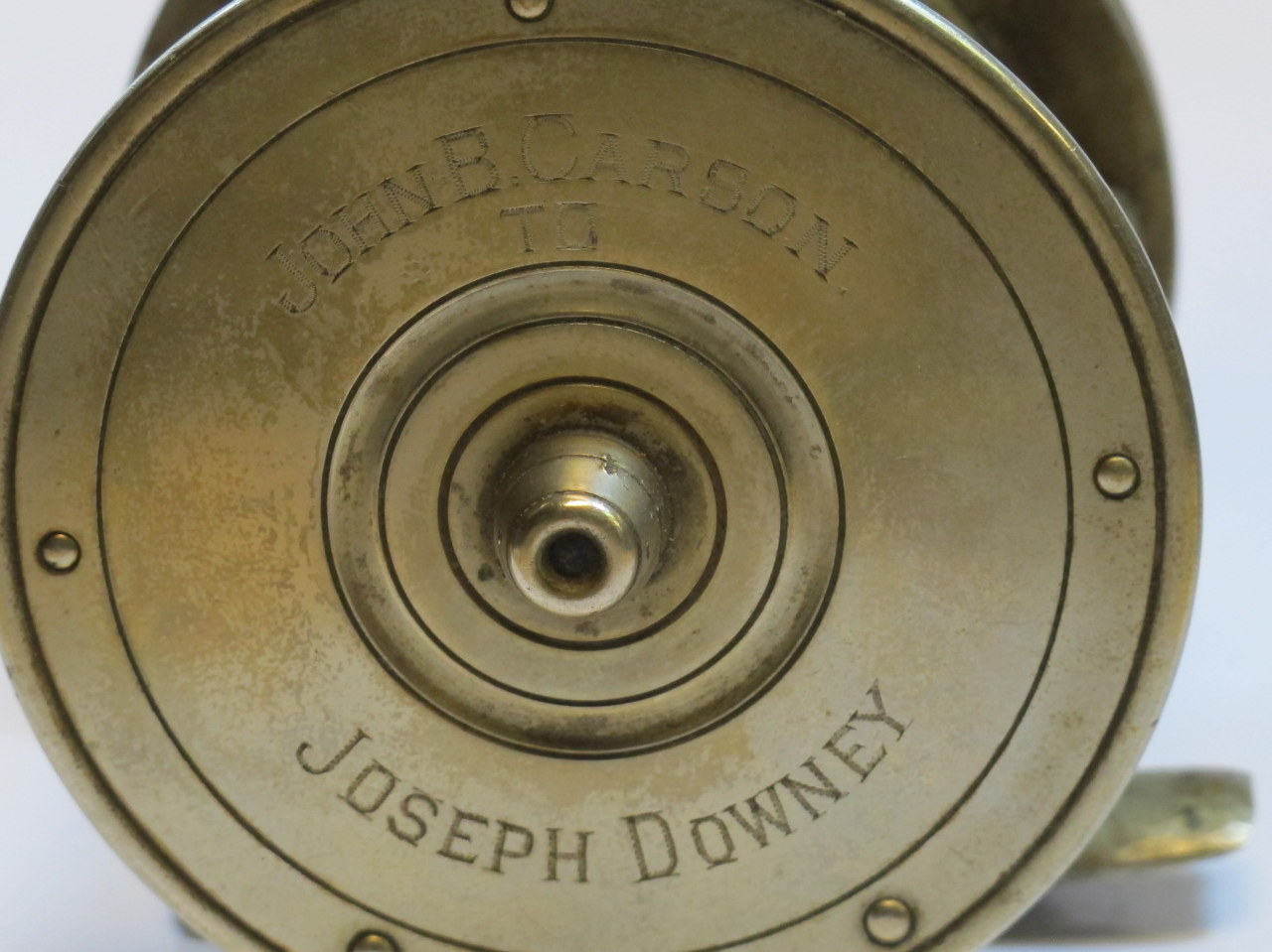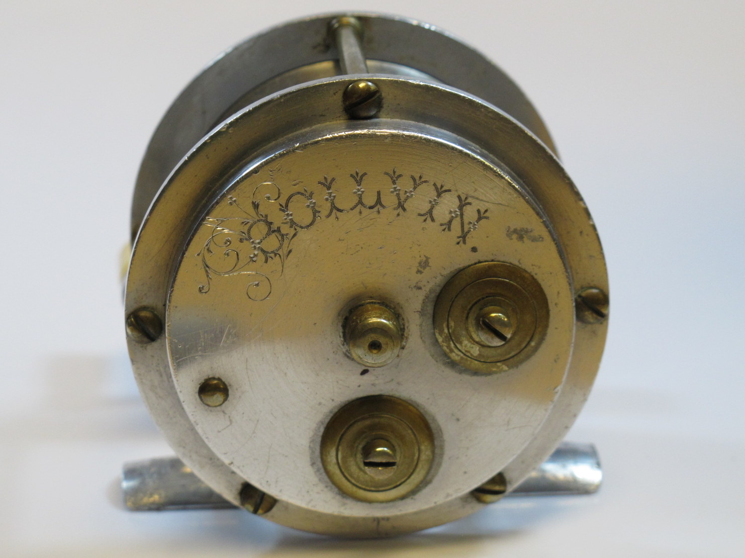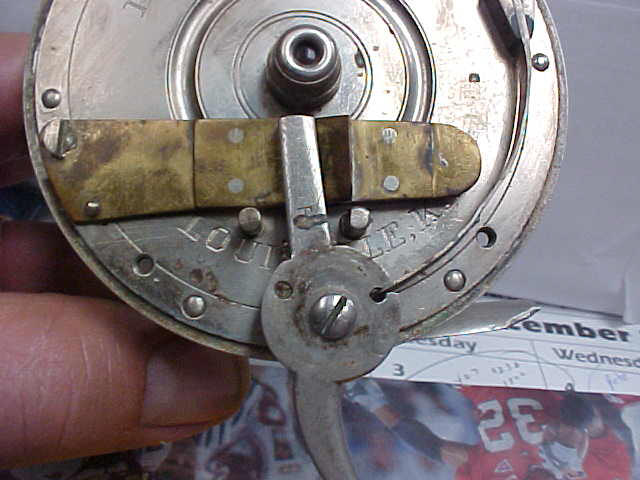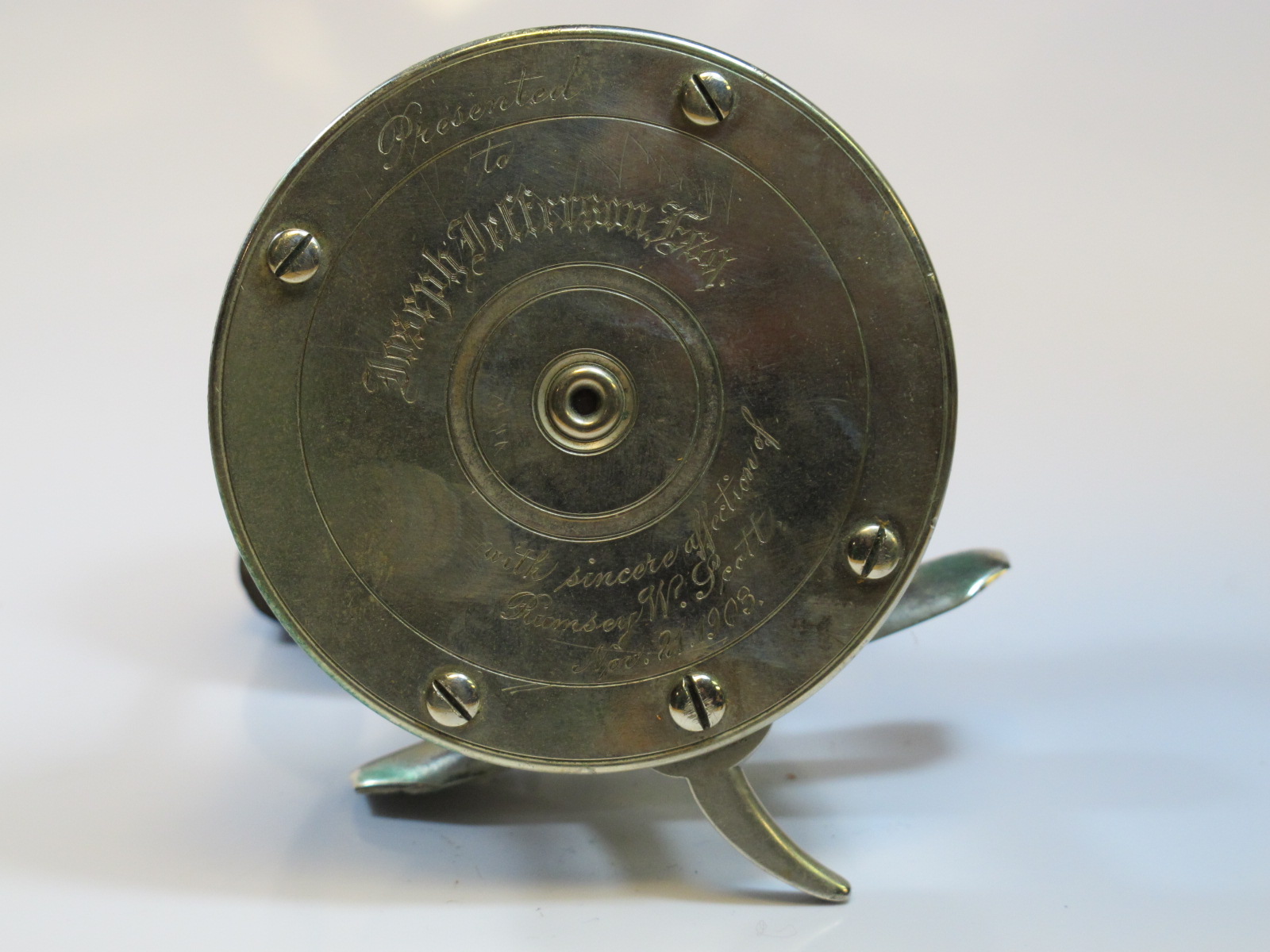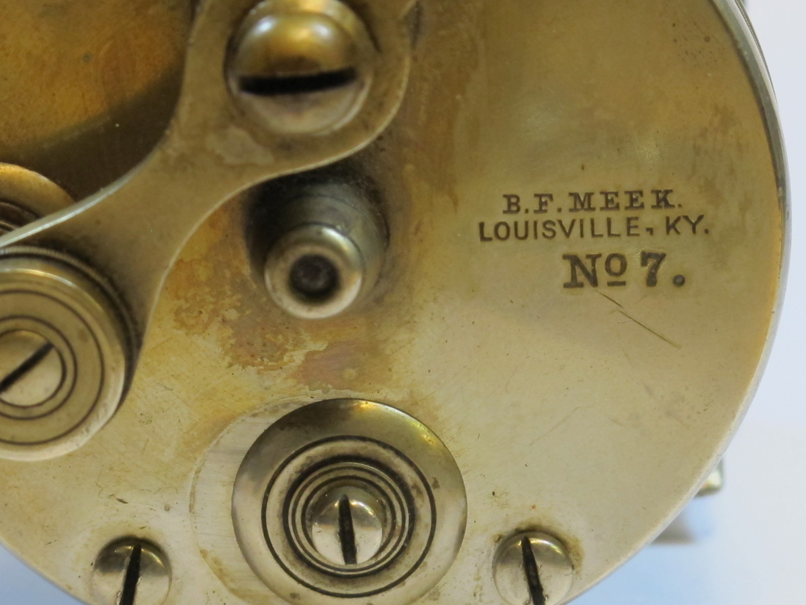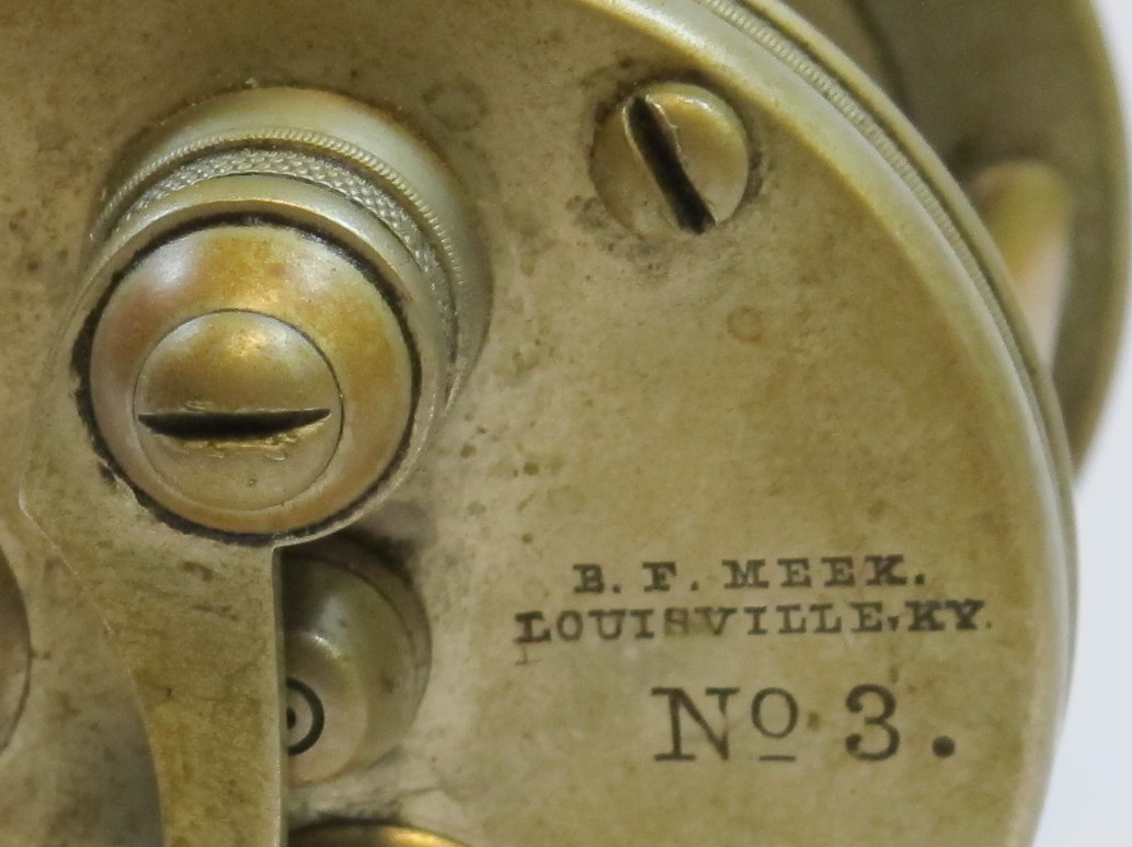 B. F. Meek, Frankfort, Ky., No 8, sn. 155; Note this reel is left handed and meant to be used upside down with custom drag lever on right, GS, engraved 'Joseph Jefferson, Esq., with sincere affection, Rumsey W. Scott, Nov. 21, 1909'SOLD |