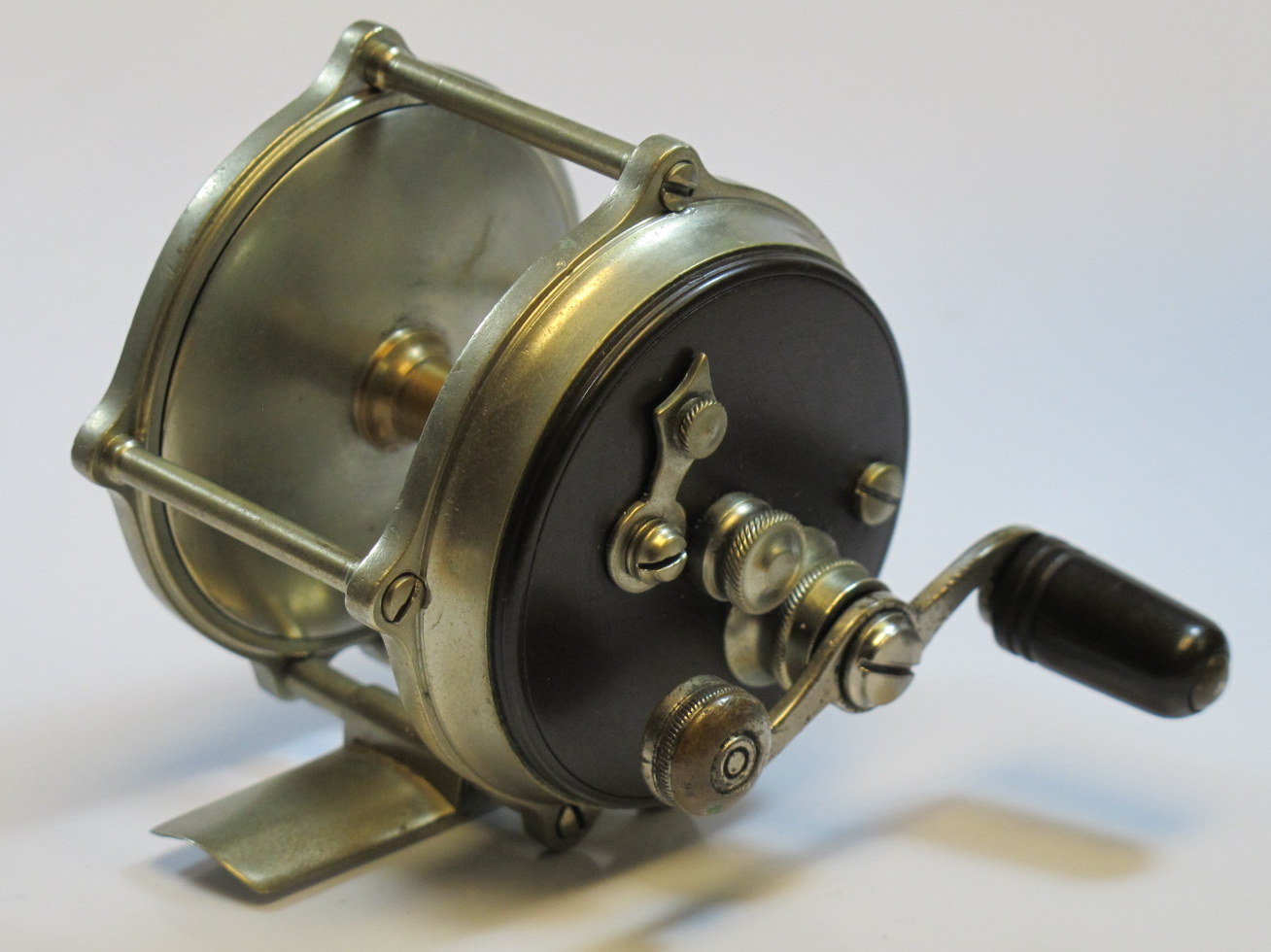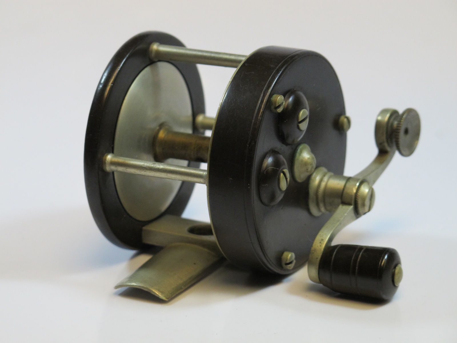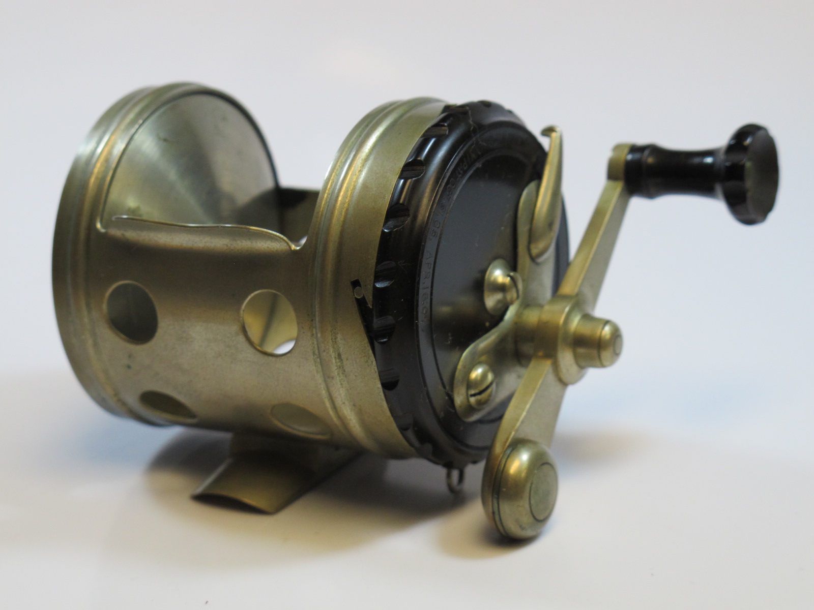 E. Holtzmann, N.Y., Pat. April 16, 1907, rare trout size, ultra light, Knurled face plate, free spool shift leverSOLD |