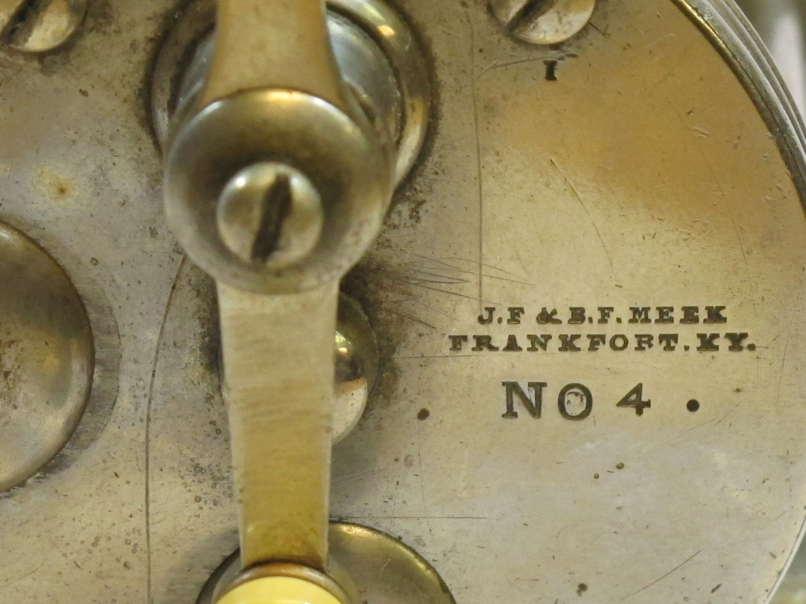 J.F. & B.F. Meek, Frankfort, Ky., numbered screws, no sn, no model #, Size '4', marked 'W.F.H.', end plate in two pieces, and soldered, GSSOLD |